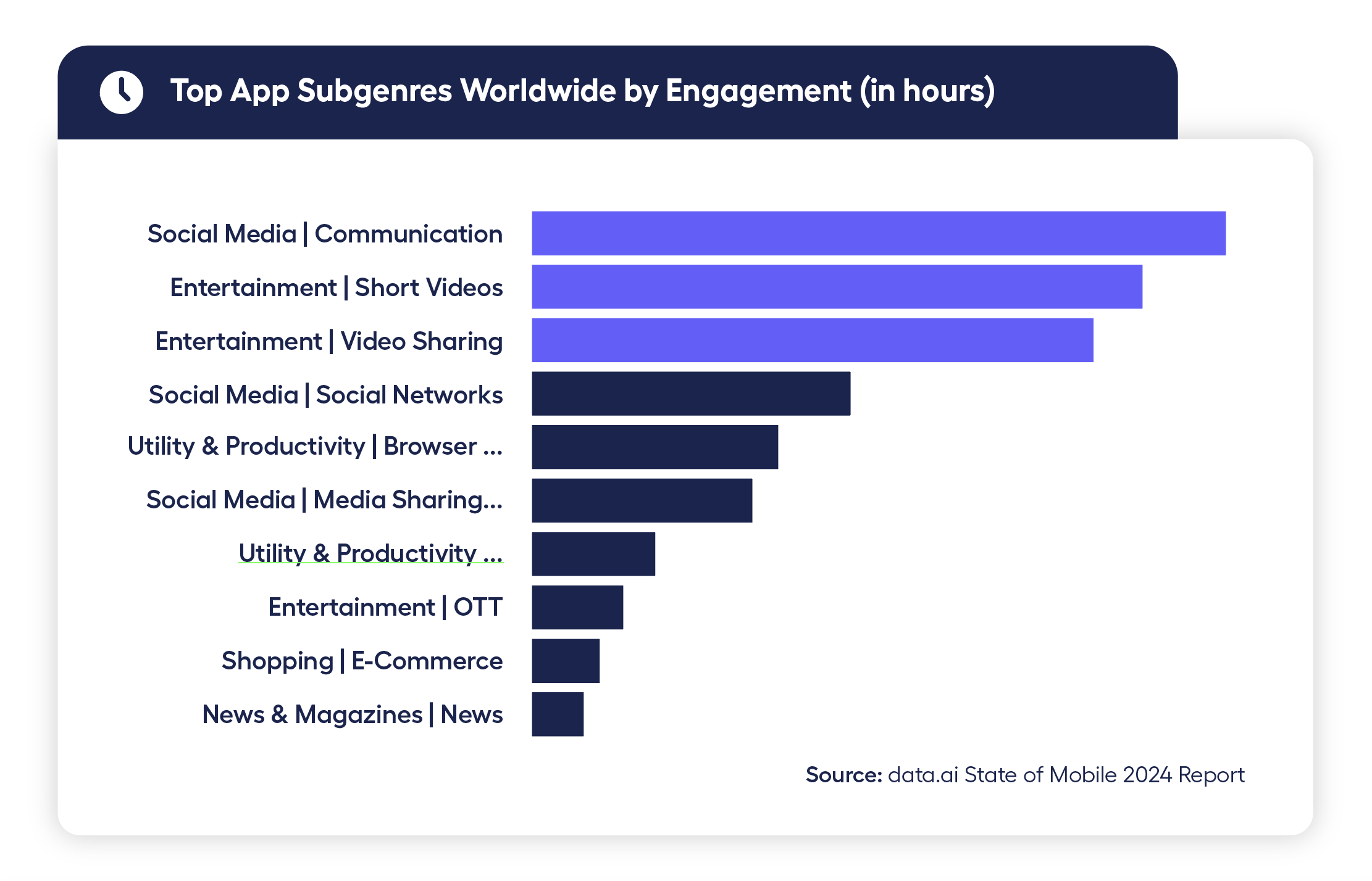 But it does look like users are spending more time on their mobile devices – six percent more than in 2022. Of the total 14 billion hours per day globally spent on Android devices alone, 2.3 trillion hours were spent in social apps. Entertainment apps and utility apps – such as Google Chrome – also drove twelve-digit engagement times in 2023.