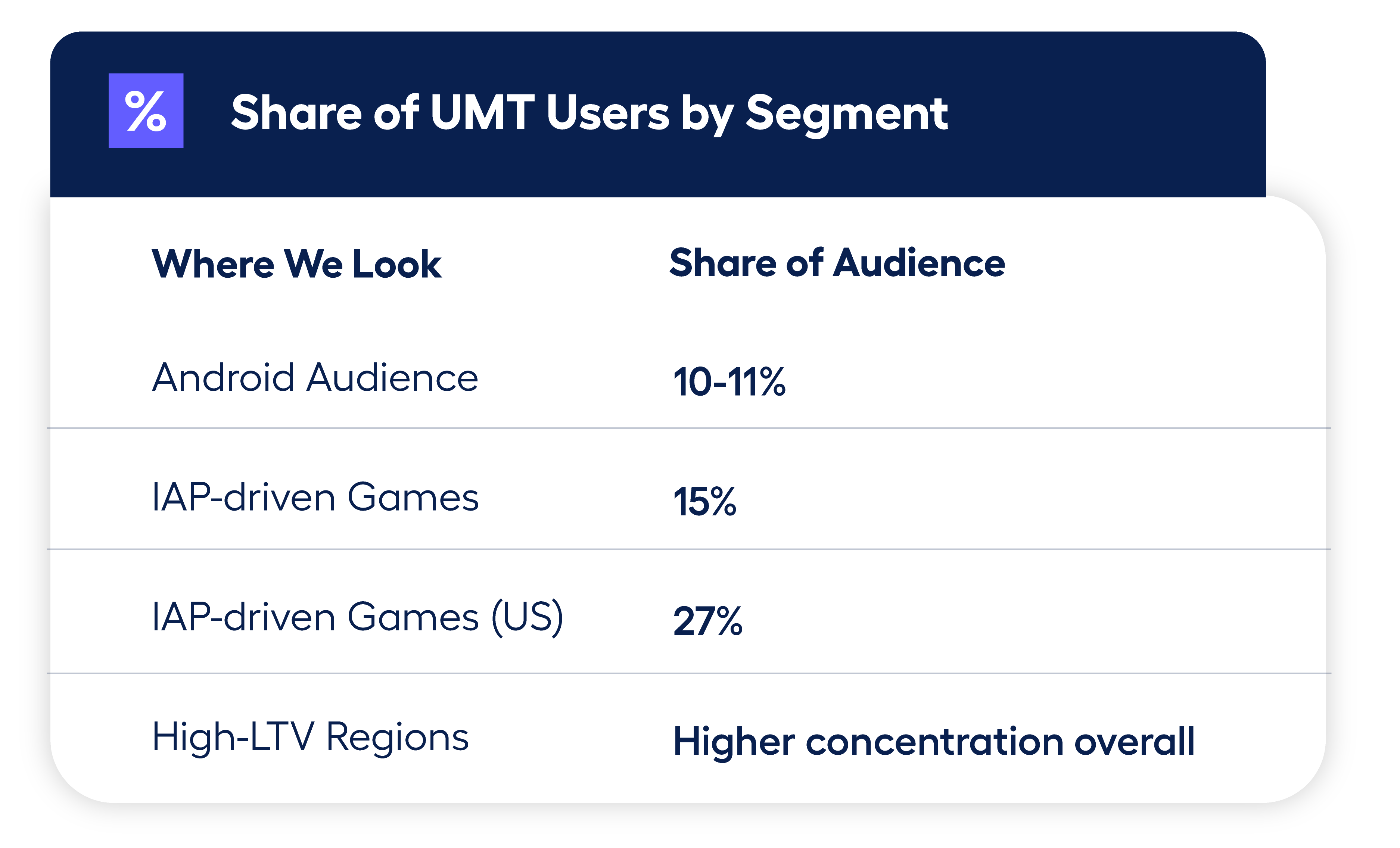 For a puzzle game in Japan, it can be someone spending a lot of time in the app, progressing faster and staying in the app longer than a regular user. For the same game in the US, a UMT user may have shorter session time but start spending earlier.