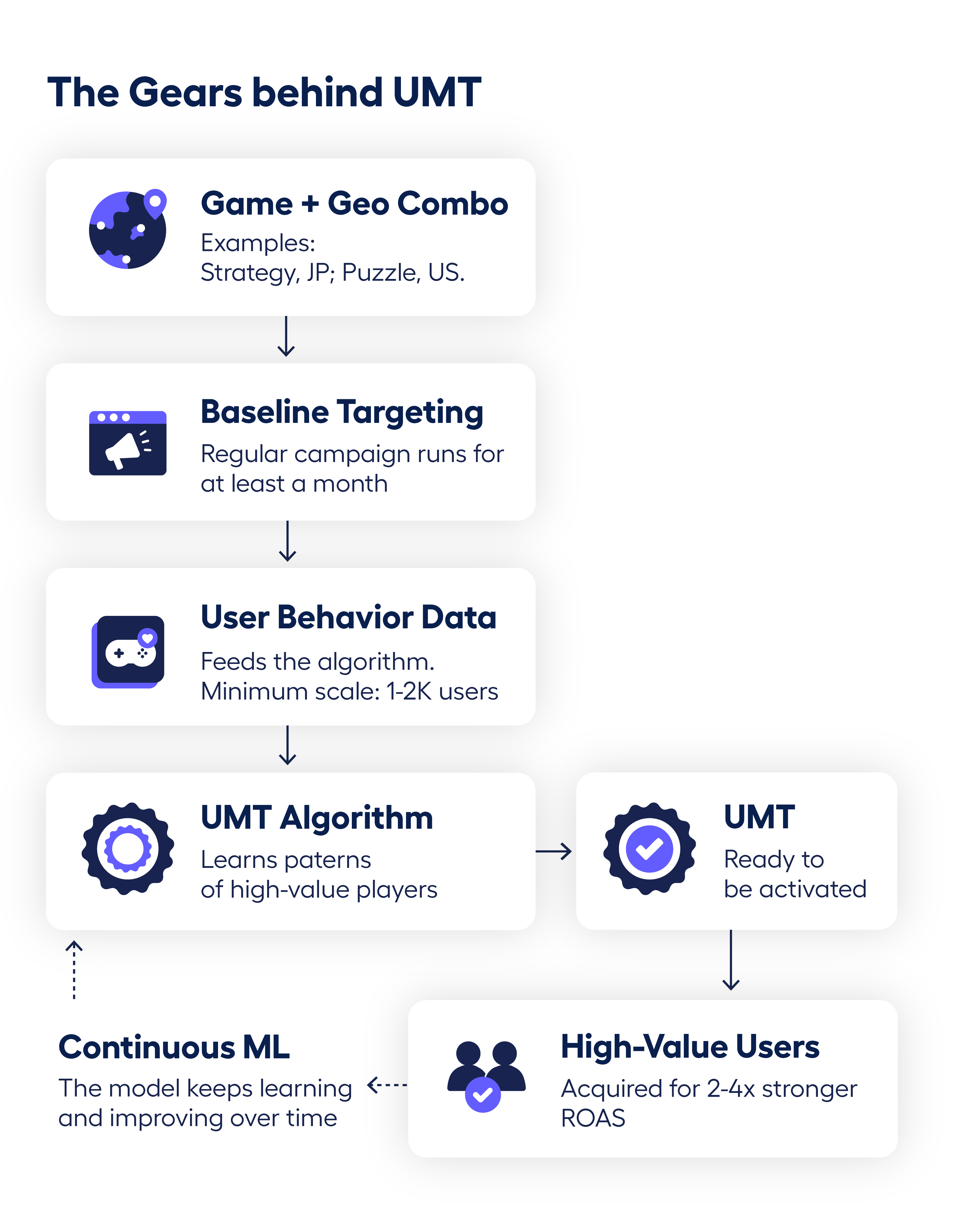Games aren’t constant. Almost all of them have LiveOps and events, and that affects user behavior. The UMT algorithms keep learning and improving over time as partners make updates in their games. If the model doesn’t keep learning, it stays optimized to the old behavior, which we don’t allow.