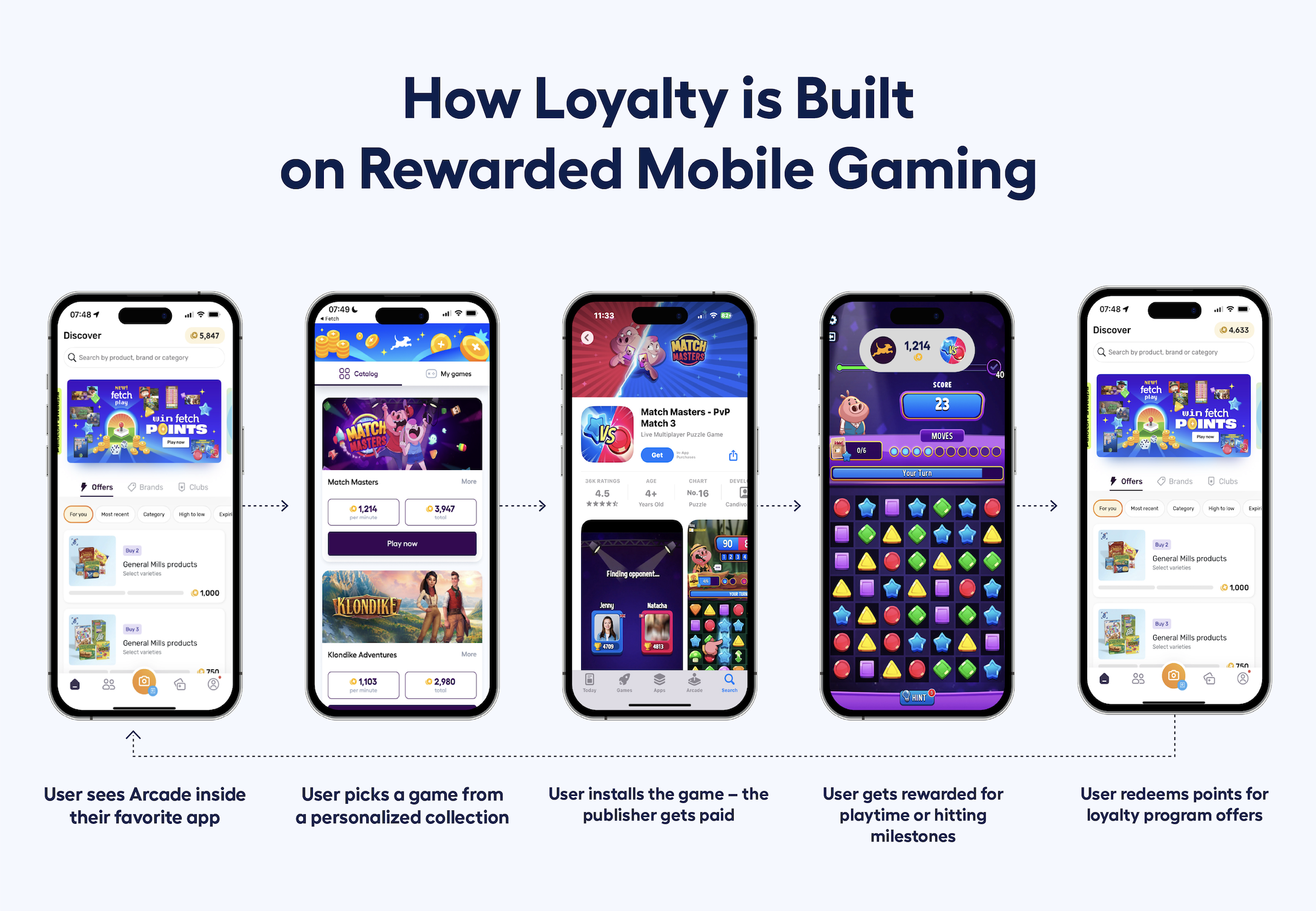 For instance, brands’ integration of mobile gaming into loyalty addresses both short-term revenue targets – by keeping users active – and long-term retention goals, ensuring users remain engaged well beyond initial sign-up and make repeat purchases. By integrating Arcade, a rewarded mobile game interface, into their apps, America’s rewards app Fetch saw a free 5% increase in app open rates and 10% jump in customer lifetime value, while the health-app Macadam pushed its ARPDAU by 30%. All by simply rewarding users for playing popular mobile games tailored to their interests.