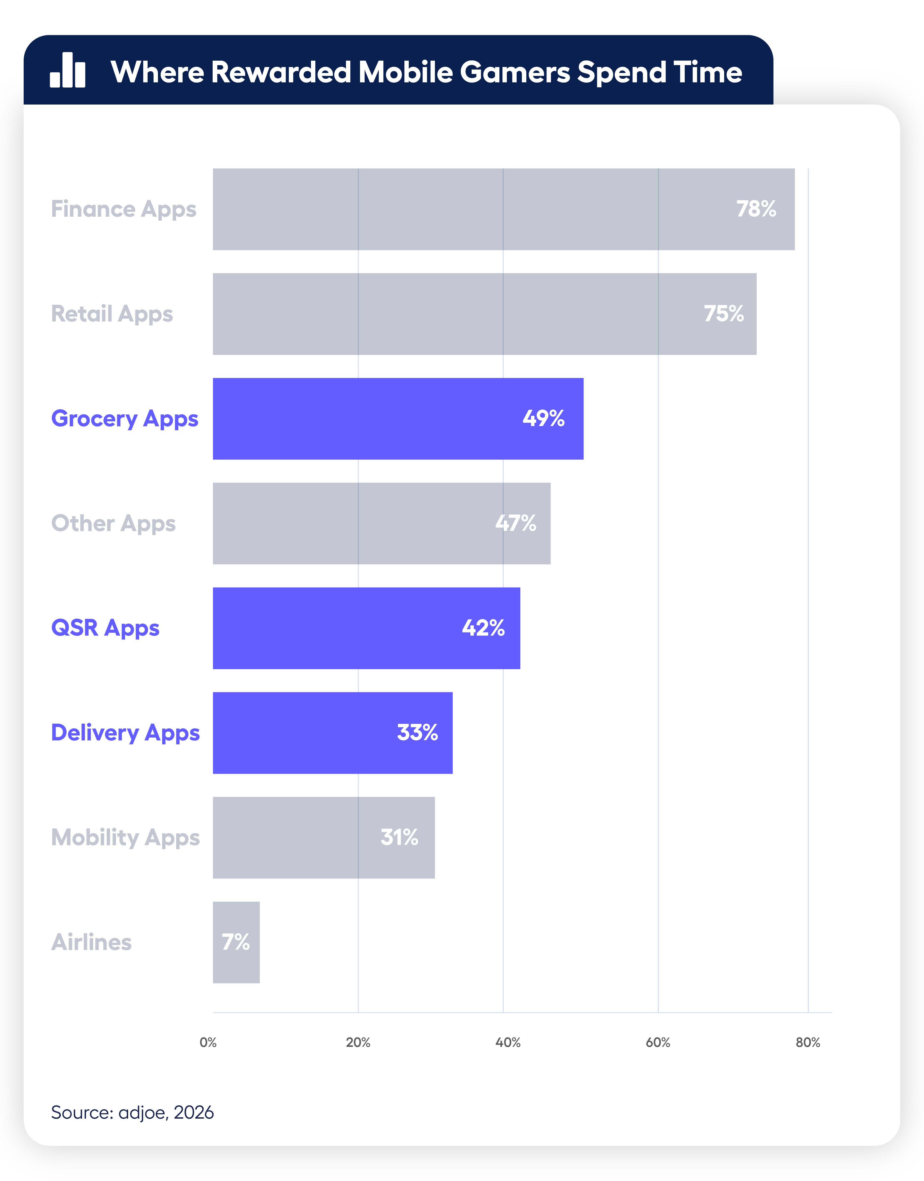 Across the analyzed markets, nearly half of rewarded users engage with grocery apps, while 42% use quick-service restaurant apps and around 33% use delivery platforms.