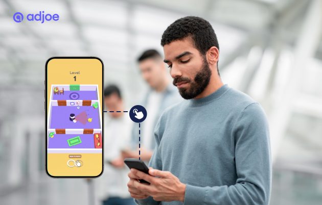 close up of person holding a phone with decorative items: advertiser, publisher, ad network