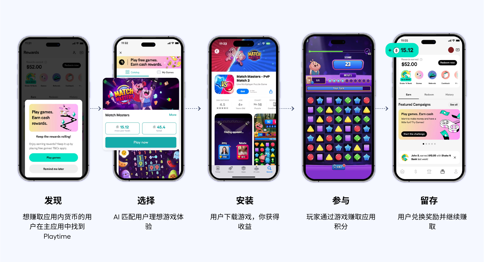 在 Playtime 中,首个奖励到手很快。用户安装、打开游戏、短时间体验,就能看到奖励到账。这个“安装 → 体验 → 获得回报”的闭环非常迅速,让用户从第一场就觉得值得参与,有效降低早期流失。