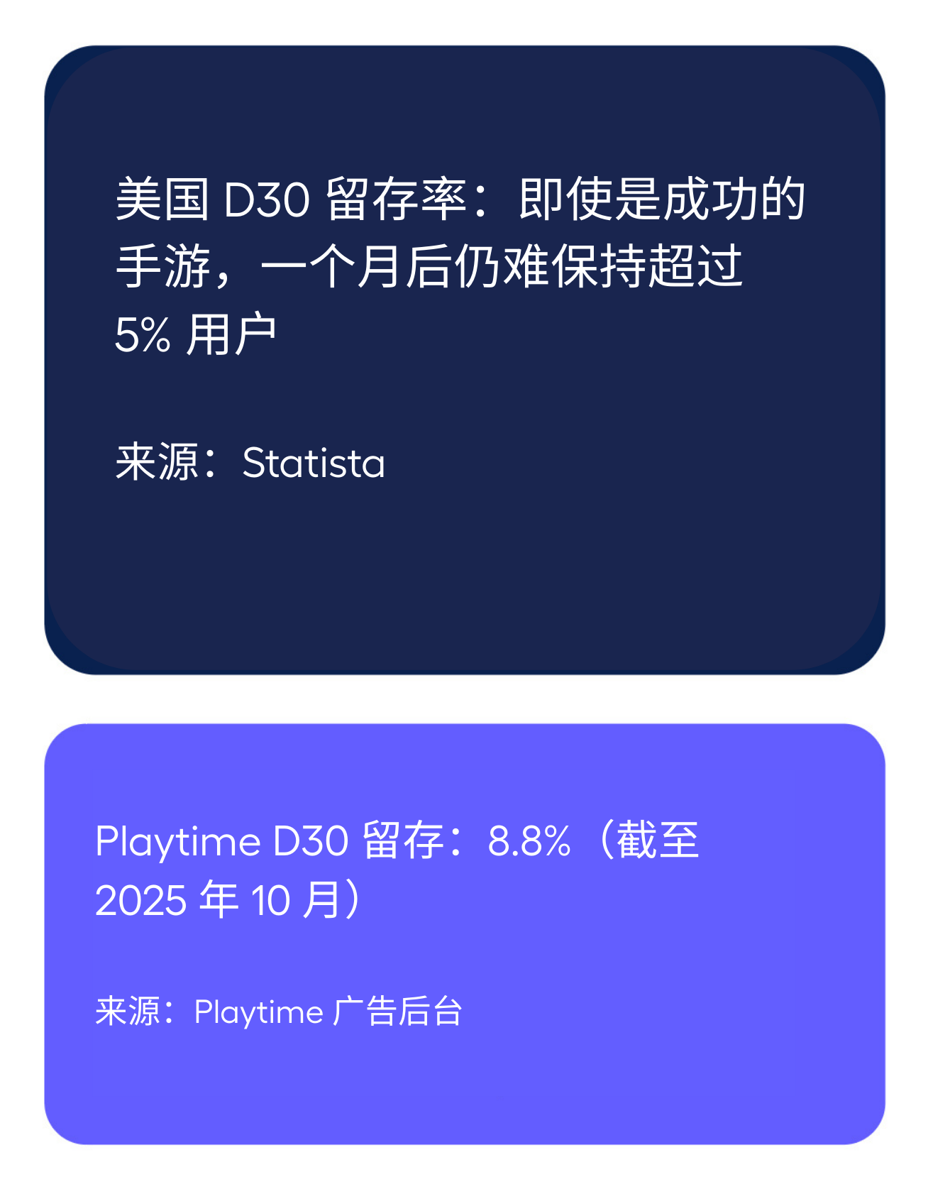 所以,当你看 Playtime 表现时,看到的是奖励、游戏匹配和高意图流量共同作用的结果。这就是 D7 和 D30 数据不像短期飙升,而像一个可预测的用户群的原因。